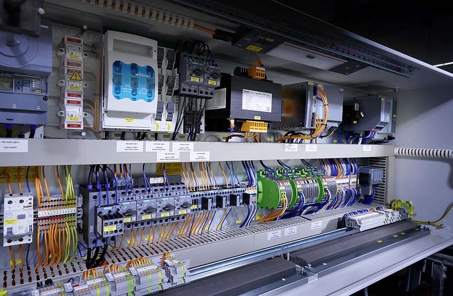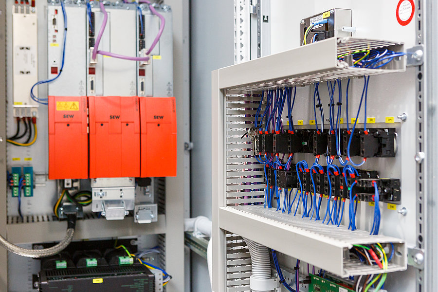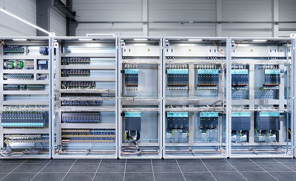 In unserem 1.000 m² großen Zentrum für Schaltschrankbau montieren, verdrahten und prüfen wir unsere Schaltschränke: Von Steuer- und Leistungsschränken über Frequenzumrichterschränke und Klemmkisten bis hin zu Bedienpulten und -stellen.